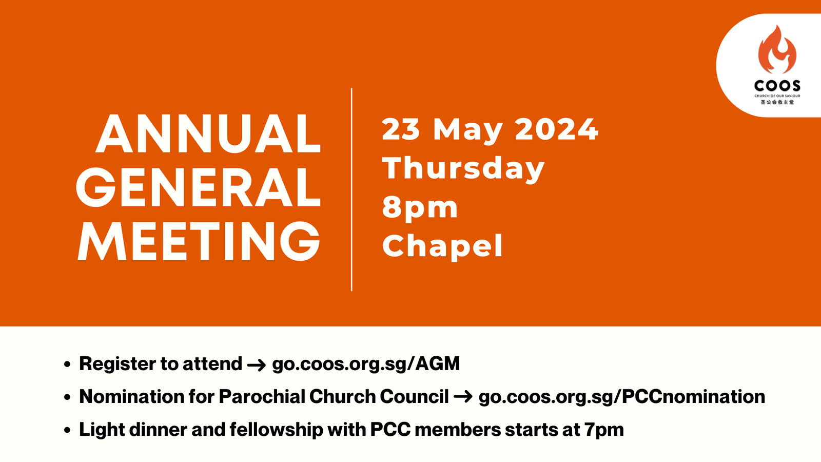 – We will provide dinner at 7pm. Do come and fellowship with our Parochial Church Council (PCC) and other COOS family members.