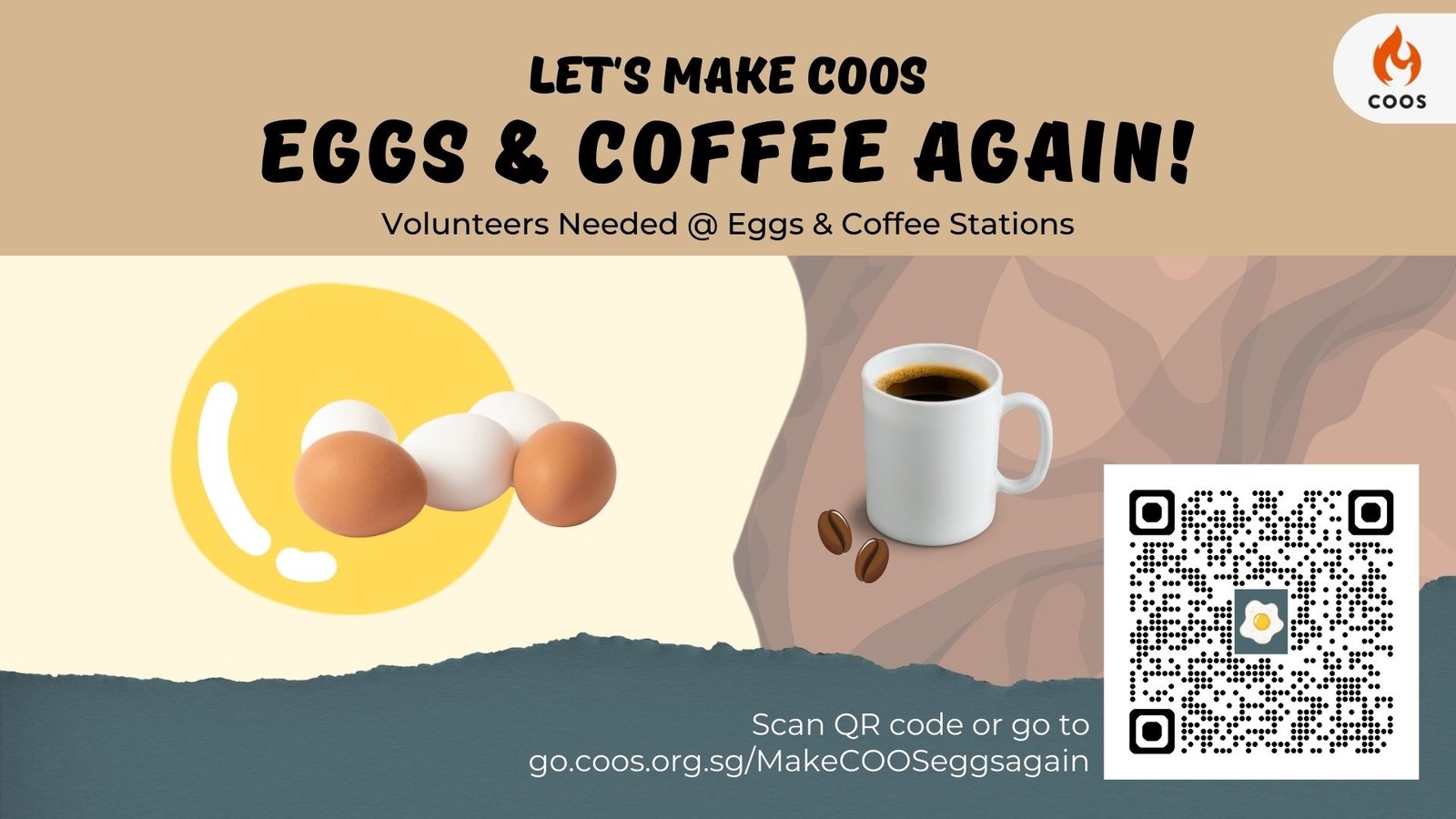 Hens Hands needed to run Eggs & Coffee Stations! The COOS Egg and Coffee Corner is recruiting again and we need your help to serve the community with eggs and coffee! Do join us if you are keen to lend a hand and together, let’s make COOS Eggs AGAIN! No experience needed! Scan the […]