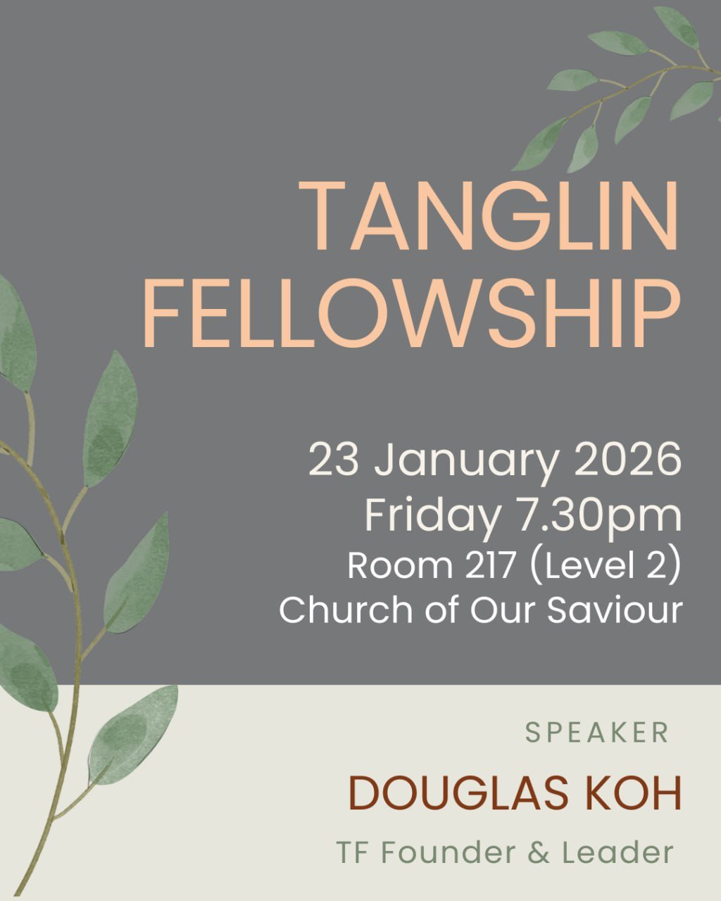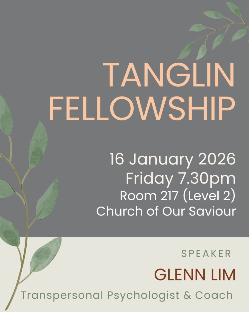 TANGLIN FELLOWSHIP 6 February 2026 | 7.30pm | Room 217 Speaker: Ashley Tan Tanglin Fellowship meets on Friday nights in Church of Our Saviour. All are welcome to worship, fellowship, and be encouraged by hearing about how God works in people’s lives in various spheres. Tanglin Fellowship comes under COOS Connect’s umbrella of special interest […]