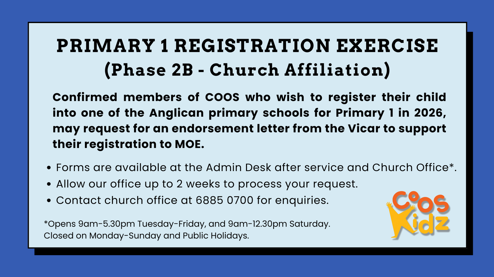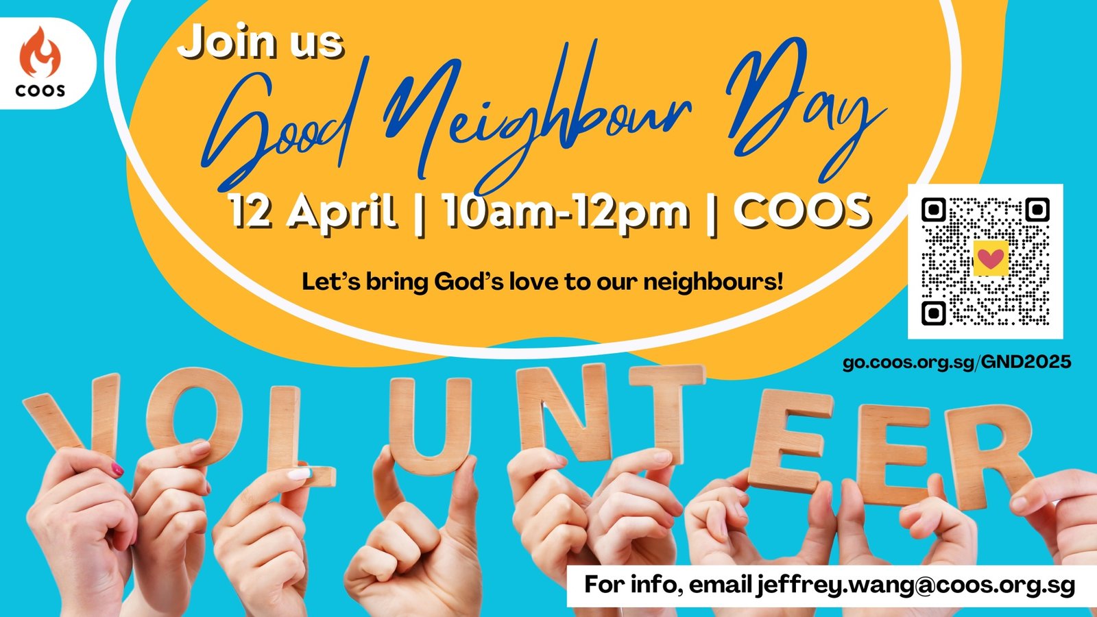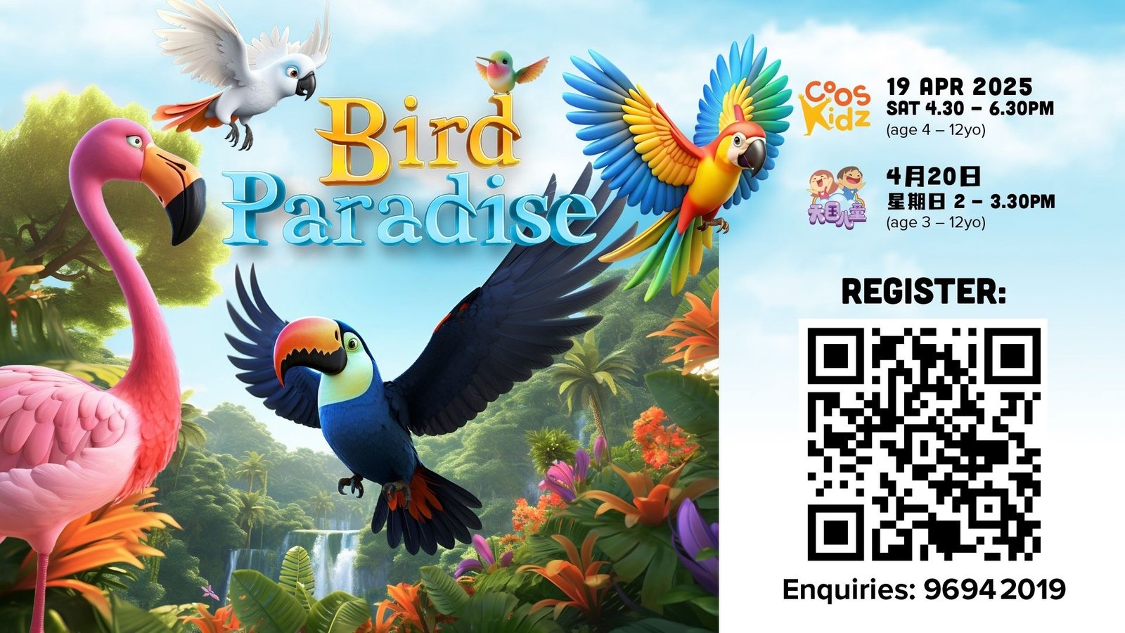 COOSkidz Outreach Party 19 April (Saturday) 4.30pm to 6.30pm God wonderfully makes us special and unique. This April 19, we invite children to fly over for a feather-riffic time as we celebrate God’s beautiful and colourful creation! COOSkidz’ outreach party is on Saturday, 19 April, from 4.30pm to 6.30pm. Our Kingdomkidz’s Chinese edition follows on […]