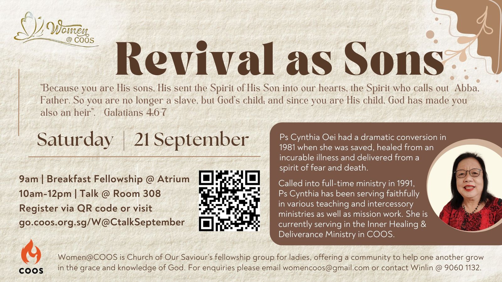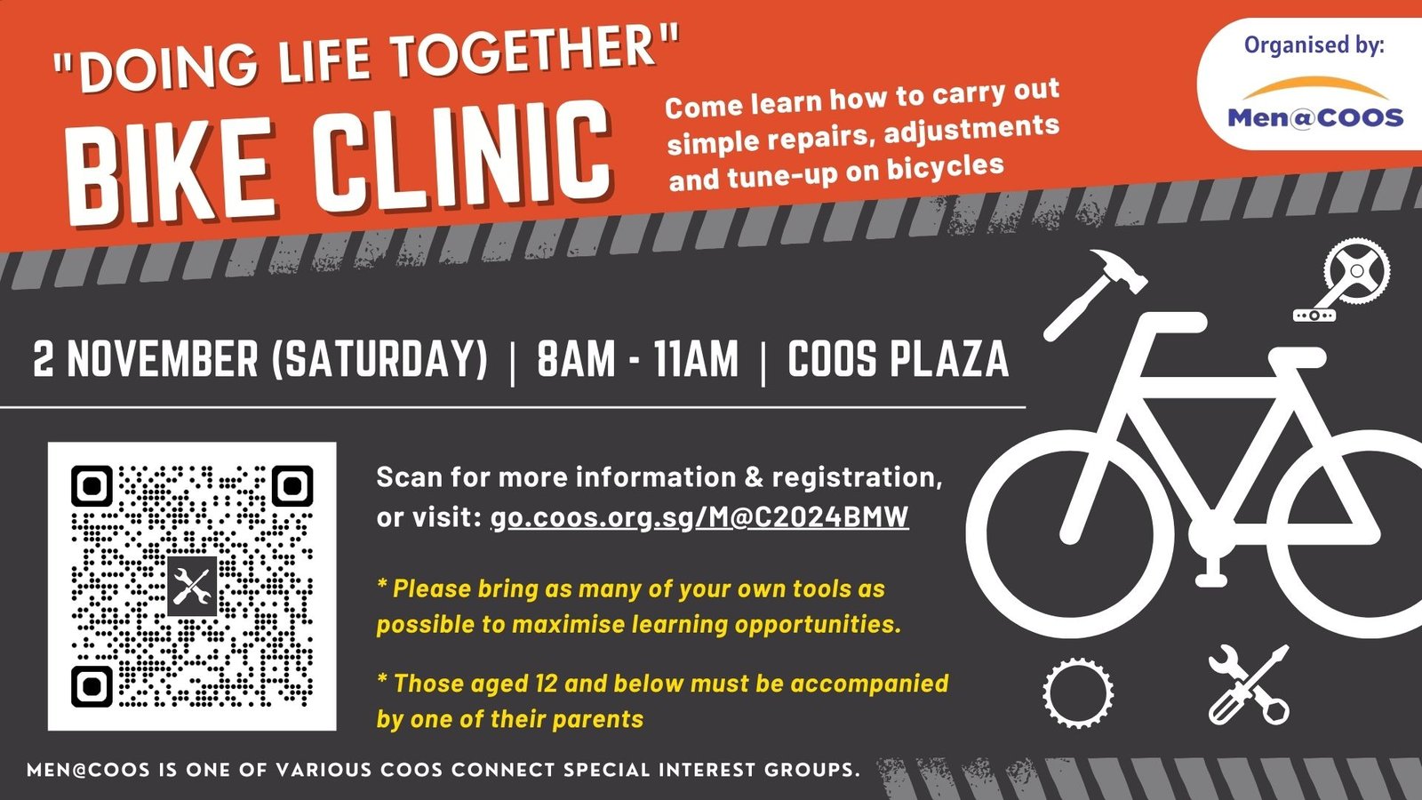 BIKE CLINIC by MEN@COOS 2 November (Saturday) 8am – 11am COOS Plaza* Join us at this Bike Clinic and get hands-on experience performing simple repairs, adjustments, and tune-ups on your bicycle. Pedal your way to join us at this bike maintenance workshop on the morning of 2 November (Saturday) at our COOS Plaza, next […]