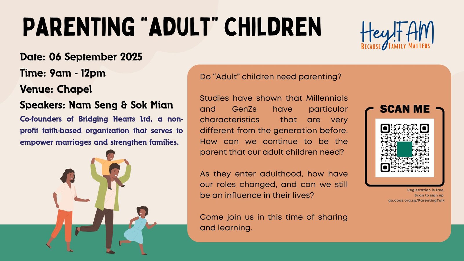 Parenting “Adult” Children 6 September | 9am – 12pm Chapel @ Level 4 Just as we need to continue to learn more about God’s ways, His plans and purposes for us, those who are parents also have to grow in their ways of parenting as children enter different life stages. To support parents of adult […]