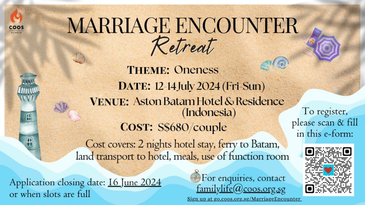 Registration is now open for this Marriage Encounter Retreat which will be held in Batam. We have limited vacancies so do sign up early via the QR code or visit go.coos.org.sg/MarriageEncounter. For more information, you can email our Family Life Ministry at familylife@coos.org.sg.
